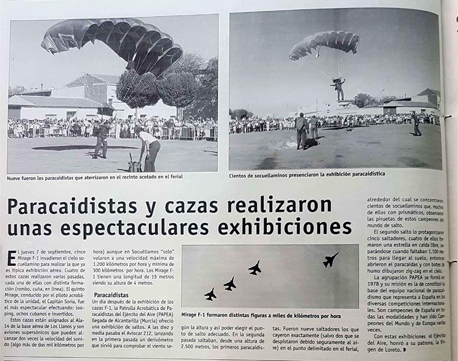 Hace 25 años, cuando la fiesta de la Virgen de Loreto y de la Vendimia aún no se llamaba Manchavino, ya contábamos con una exhibición aérea del Ejército del Aire (sin el Espacio). En el año 2000, esta se dividió en dos jornadas: el jueves 7 de septiembre tuvo lugar la exhibición de los Mirage F-1 del Ala 14, que volaron a 1.200 km/h en distintas formaciones y vuelos acrobáticos. Al día siguiente, viernes 8 de septiembre, fue el turno de los paracaidistas de la PAPEA, con nueve saltadores que aterrizaron en el ferial. Posteriormente, esta exhibición pasaría a realizarse en el Paquito Giménez.