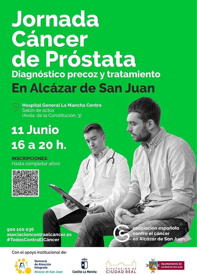 El próximo 11 de junio tendrá lugar en el salón de actos del hospital La Mancha Centro de Alcázar de San Juan la "I Jornada de cáncer de próstata" organizada por la Asociación Española Contra el Cáncer. Es un evento dirigido al público en general donde podremos escuchar tanto a profesionales sanitarios especializados en diferentes áreas de la oncología como a pacientes que han pasado por este proceso. Os animamos a inscribiros (por QR, llamando al 900100036 o en la sede local los martes de 18:00 h a 19:00 h.