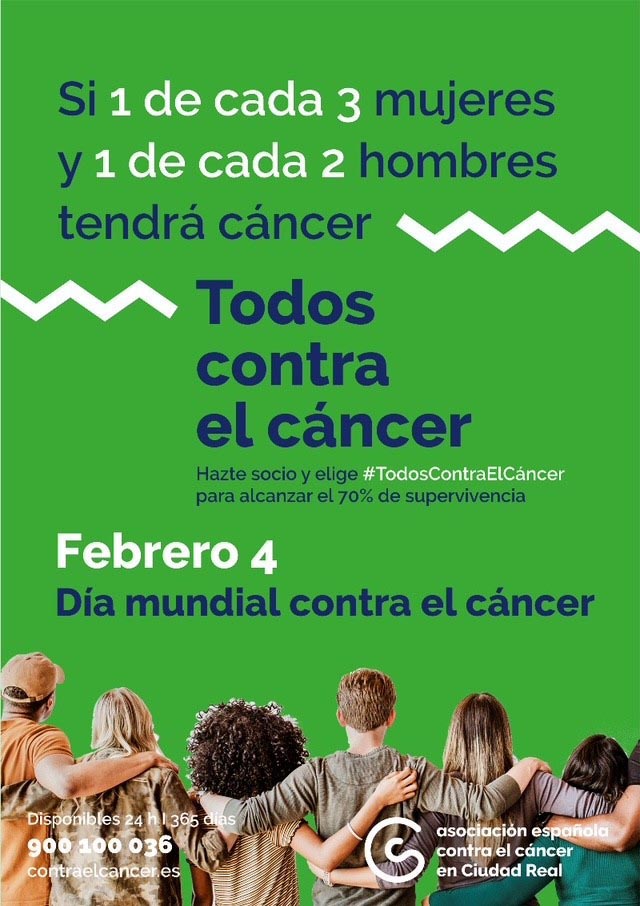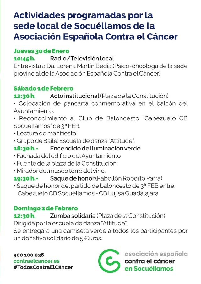 Hoy martes a las 12:00 h. en el Ayuntamiento de Socuéllamos la Concejal de Salud, María José Beteta junto con el Presidente de la Junta local de la AECC, Sebastián García, presentarán los actos programados con motivo del Día Mundial Contra el Cáncer, que comenzarán el próximo jueves 30 de enero para terminar el domingo 2 de febrero.