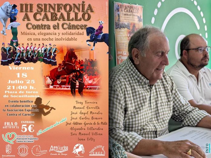 Ayer miércoles, a las 12:00 del mediodía, el presidente de la AECC de Socuéllamos, Sebastián García, junto a José Ángel Morales, presentó la III edición de Sinfonía a Caballo contra el Cáncer. Se trata de un espectáculo que combinará arte ecuestre, música y danza, y que se celebrará el próximo 18 de julio a las 21:00 h en la Plaza de Toros Lorenzo Manuel Villalta de Socuéllamos.