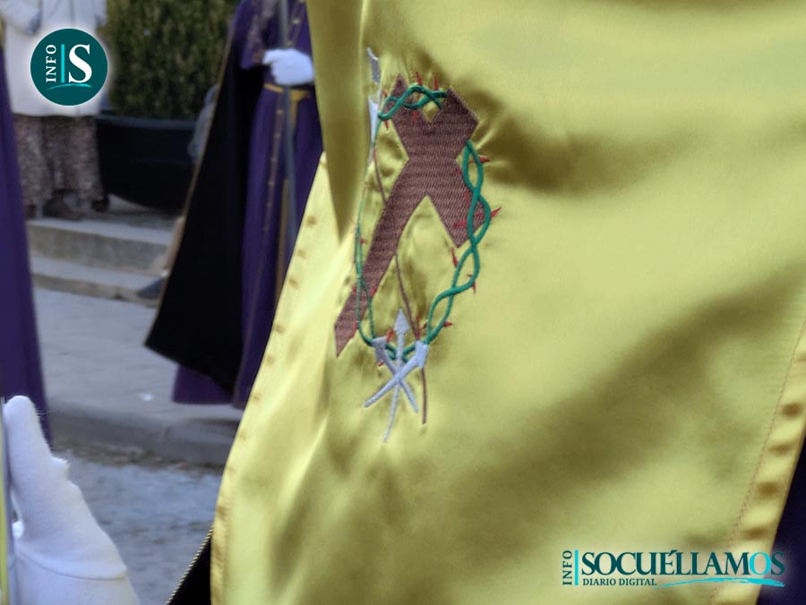 En cuanto a la indumentaria, los nazarenos visten túnica morada con adornos en las bocamangas y botonadura en color amarillo. El conjunto se completa con cíngulo amarillo, antifaz del mismo color con el escudo de la cofradía y capa morada, configurando una estética sobria y reconocible dentro del conjunto de las procesiones.