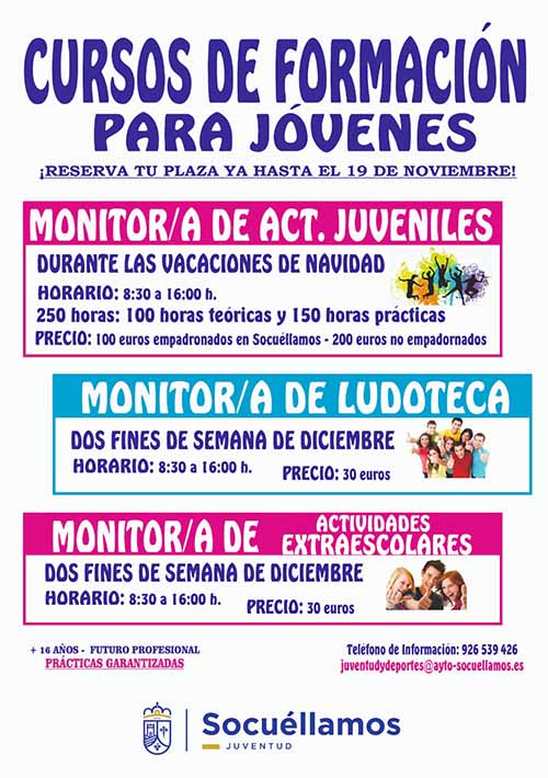 La Concejalía de Juventud del Ayuntamiento de Socuéllamos desarrollará en las vacaciones de Navidad unos cursos formativos dirigidos a los jóvenes socuellaminos (mayores de 16 años), cuyo plazo de inscripción está abierto hasta el 19 de noviembre
