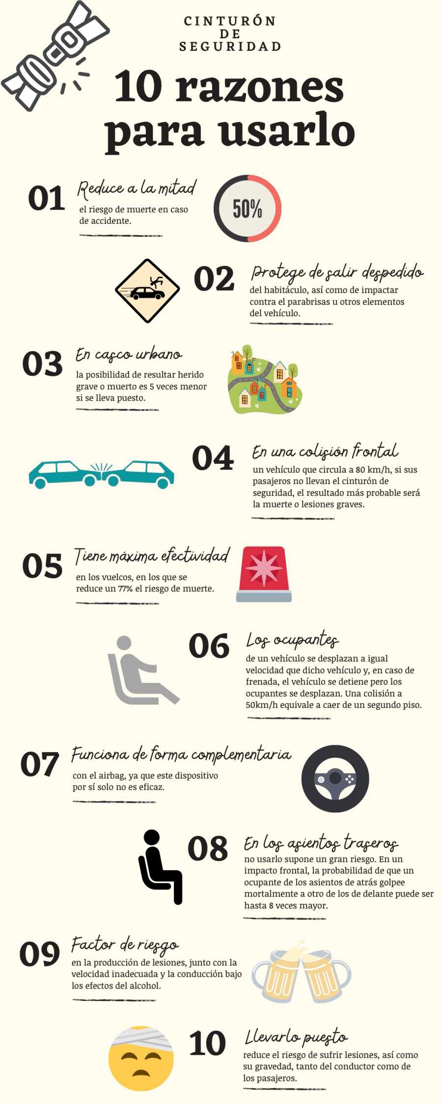 Frente a aquellos que dicen no usarlo porque “molesta” o porque “van aquí al lado”, los datos demuestran que el cinturón es el dispositivo que más vidas ha salvado y salva en carretera, puesto que su eficacia reduce a la mitad el riesgo de muerte en caso de accidente. Además, el airbag no es eficaz si no se complementa con la utilización del cinturón de seguridad ya que ambos dispositivos están diseñados para funcionar de forma complementaria.