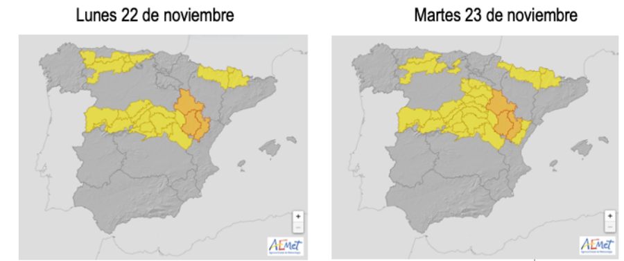 Hay avisos amarillos y naranjas por nevadas en algunas provincias desde las 00:00 horas de esta noche 22 de noviembre, tal y como se refleja en los mapas siguientes.