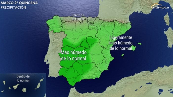 La segunda quincena de marzo estará marcada, de nuevo, por las lluvias en casi toda España. La zona con mayor probabilidad de recibir precipitaciones superiores a la media abarca el suroeste peninsular, especialmente Andalucía, Extremadura, Madrid y parte de Castilla-La Mancha.