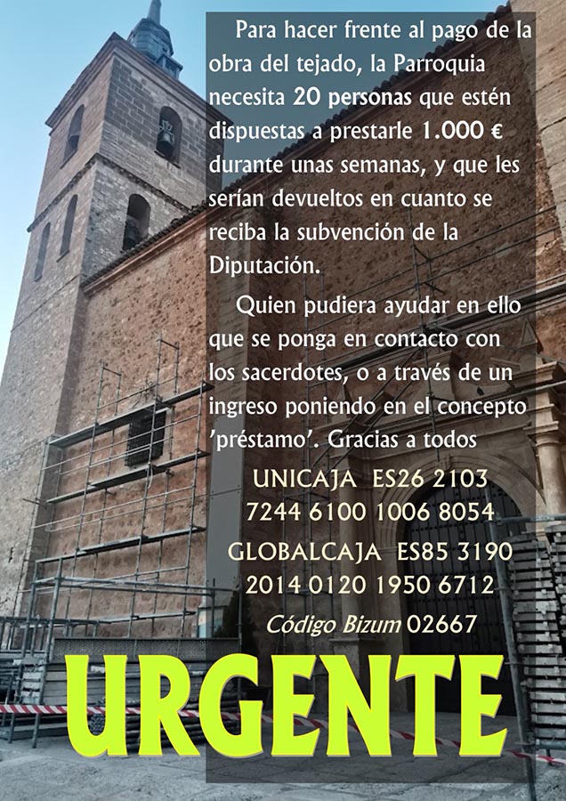 La Parroquia ha lanzado un llamamiento urgente a los vecinos de Socuéllamos con el objetivo de hacer frente al pago de la obra del tejado del templo. Según ha comunicado la institución, se necesitan 20 personas dispuestas a prestar 1.000 euros cada una durante unas semanas, cantidad que será devuelta en cuanto se reciba la subvención de la Diputación.
