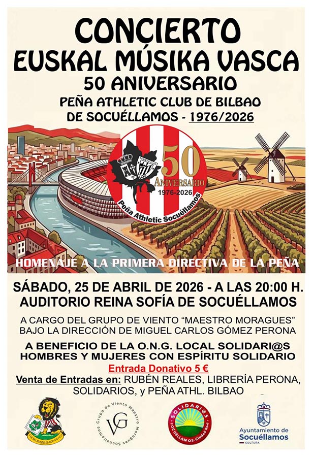 El próximo sábado 25 de abril de 2026, el Auditorio Reina Sofía de Socuéllamos será escenario de un evento cultural destacado con la celebración del concierto “Euskal Músika Vasca”, organizado con motivo del 50 aniversario de la Peña Athletic Club de Socuéllamos (1976-2026).