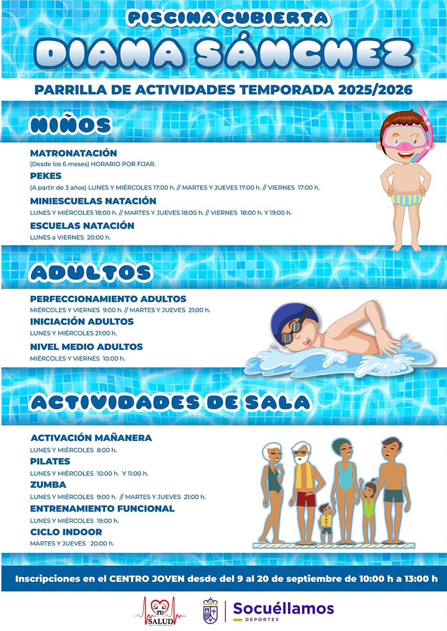 La Piscina Cubierta Diana Sánchez ha dado a conocer su programación de actividades para la nueva temporada 2025/2026, ofreciendo una amplia variedad de opciones para todas las edades, desde bebés hasta adultos, así como actividades de sala para complementar el entrenamiento.