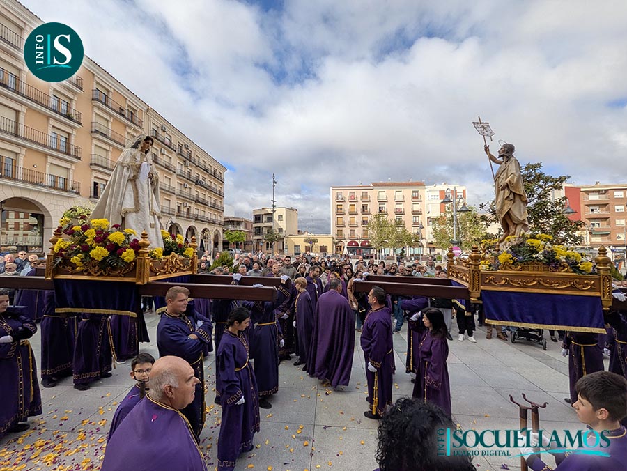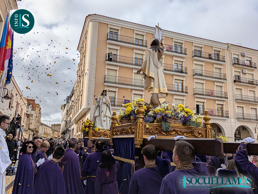La Cofradía de la Preciosísima Sangre de Cristo, con la imagen de Jesús Resucitado y la Virgen María, ha escenificado en la Plaza de la Constitución un emotivo encuentro. En ese momento, se ha retirado el velo negro de la Virgen mientras una lluvia de pétalos caía desde el balcón del Ayuntamiento y la Banda Municipal de Música de Socuéllamos, dirigida por Inmaculada Alcolea Padilla, interpretaba magníficamente unos bellos temas musicales creando una escena conmovedora para todos los presentes.