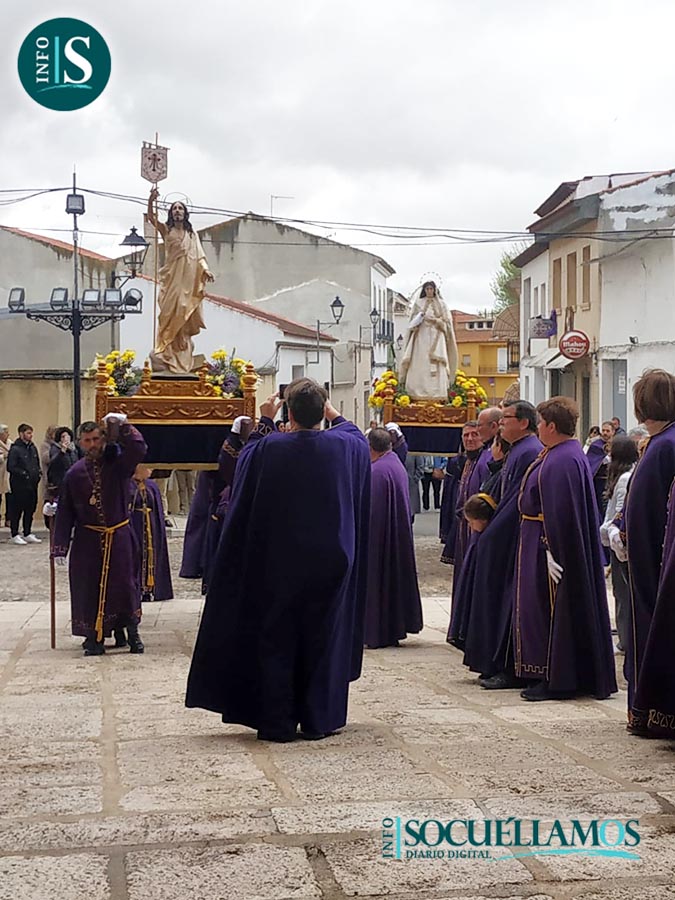 Esta mañana, con la lluvia jugando al gato y al ratón y los radares meteorológicos en los móviles marcando el paso, finalmente ha salido la Procesión del Resucitado, la más alegre de todas las de la Semana Santa socuellamina. Este año ha partido desde la Parroquia de San José, desde donde, por la calle del Rosario, ha cruzado la Plaza de la Constitución para continuar su recorrido por las calles Rosario, Fernando de Mena, Pozo Viejo y Don Pedro Bustos, finalizando en la Parroquia de la Asunción.