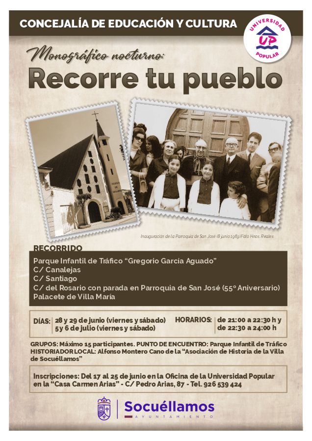 Se trata de un recorrido por el casco urbano de Socuéllamos por distintos puntos clave del Barrio de San José, en concreto prestando una especial atención a la Iglesia de San José que hace este año su 55º Aniversario. Todo ello comentado y explicado por Alfonso Montero Cano miembro de la Asociación de Historia de la Villa de Socuéllamos.