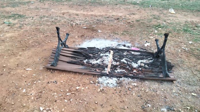 Bancos quemados, restos de suciedad, cenizas sin recoger... Estas fotografías enviadas por una lectora, hechas hoy en la zona de la Plaza de Toros son el resultado de la juerga de anoche de algunos energúmenos.