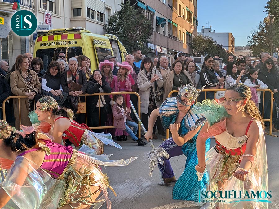 Además, el desfile ha contado con un itinerario más corto, ya que en esta ocasión se ha prescindido del recorrido por el Paseo Cervantes, Primo de Rivera y el regreso por la calle Rosario, lo que ha permitido una mayor fluidez y concentración del espectáculo en el tramo central.