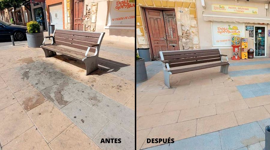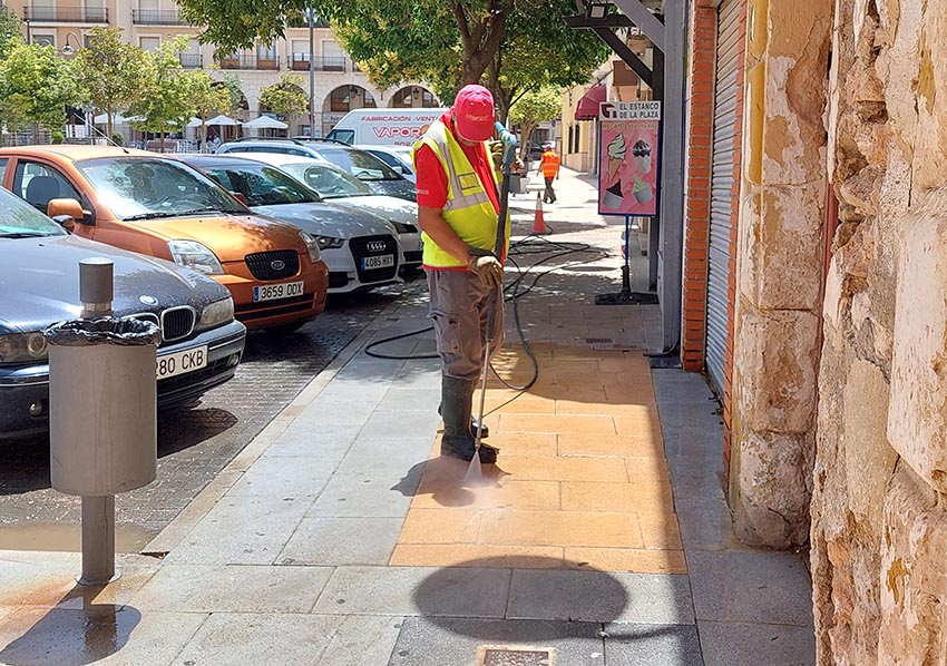 Esta empresa fue contratada por el anterior equipo de Gobierno el Psoe para limpiar el interior de la plaza, y el actual Gobierno de PP-Vox ha ampliado el servicio a todo el contorno de la plaza: acerados y soportales.