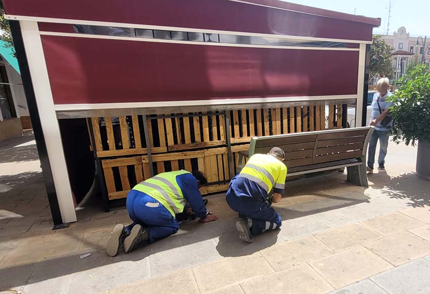 Así, se han reorganizado bancos y maceteros (aprovechando para limpiar debajo de ellos), y se han instalado maceteros en la esquina de la antigua farmacia.