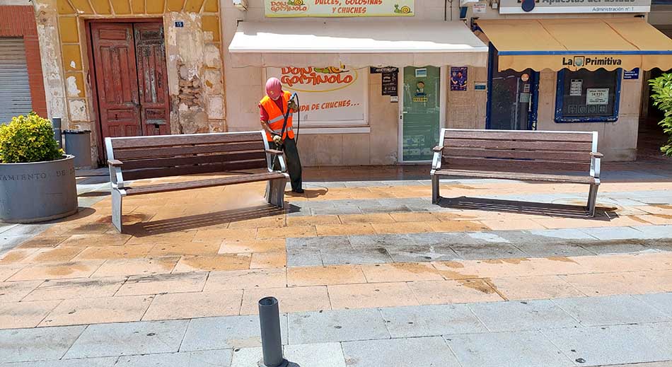 Esta empresa fue contratada por el anterior equipo de Gobierno el Psoe para limpiar el interior de la plaza, y el actual Gobierno de PP-Vox ha ampliado el servicio a todo el contorno de la plaza: acerados y soportales.