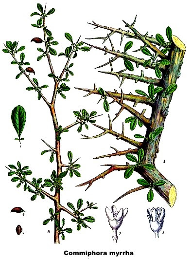 La mirra es una resina de color rojizo que proviene de las especies del género Commiphora, las cuales son nativas del noreste de África y las zonas adyacentes de la Península Arábiga. La Commiphora Mirra, es muy común en la producción de la mirra, se pueden encontrar en las rocas poco profundas, de los suelos de Etiopía, Kenia, Omán, Arabia Saudita y Somalia. Cuenta con ramas espinosas con hojas escasas, que crecen en grupos de tres, y puede alcanzar una altura de 3 metros.