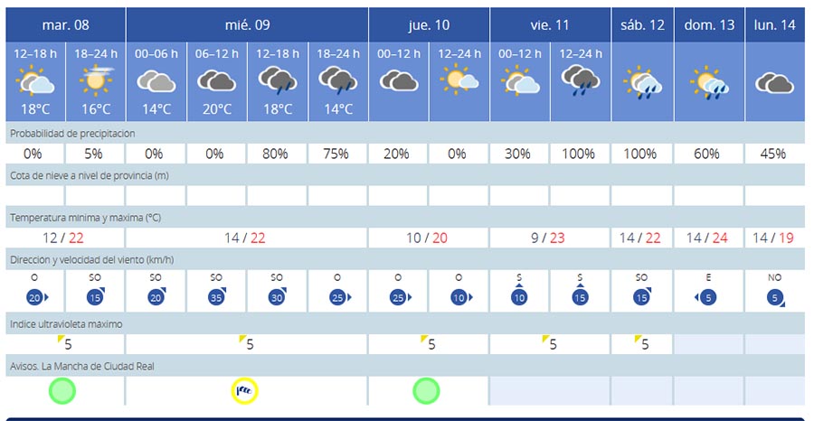 En la zona centro los efectos serán más atenuados que en el noroeste pero en Socuéllamos tendremos mañana miércoles alerta por vientos fuertes y lluvias sobre todo a partir de las 12 del mediodía en adelante. los vientos llegarán a 35 km/h.