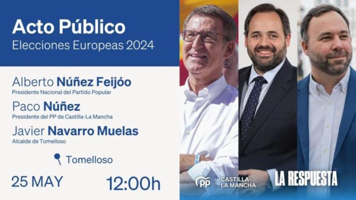 El presidente del PP, Alberto Núñez Feijóo, clausura mañana, sábado, a partir de las 12:30 horas, un mitin junto al presidente del PP de Castilla-La Mancha, Paco Núñez, que tendrá lugar en Tomelloso. También intervienen en el acto la vicesecretaria de Organización Territorial del PP, Carmen Fúnez, el presidente provincial del PP de Ciudad Real, Miguel Angel Valverde, y el alcalde de Tomelloso, Javier Navarro.