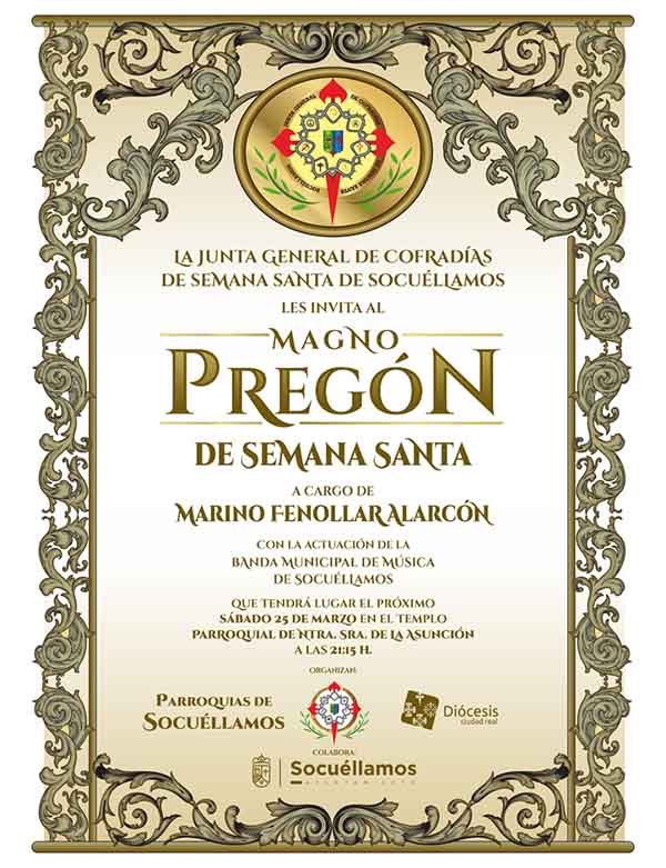 La Semana Santa socuellamina tendrá su primera gran cita este sábado 25 de marzo con la celebración del Magno Pregón organizado desde la Junta General de Cofradías de Semana Santa y las Parroquias de Socuéllamos.
