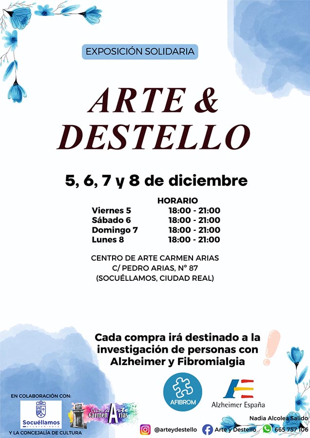 La localidad de Socuéllamos acoge los días 5, 6, 7 y 8 de diciembre la exposición solidaria “Arte & Destello”, una iniciativa benéfica que destinará la recaudación obtenida a la investigación sobre el Alzheimer y la Fibromialgia. El evento se desarrolla en el Centro de Arte Carmen Arias, situado en la calle Pedro Arias, nº 87.