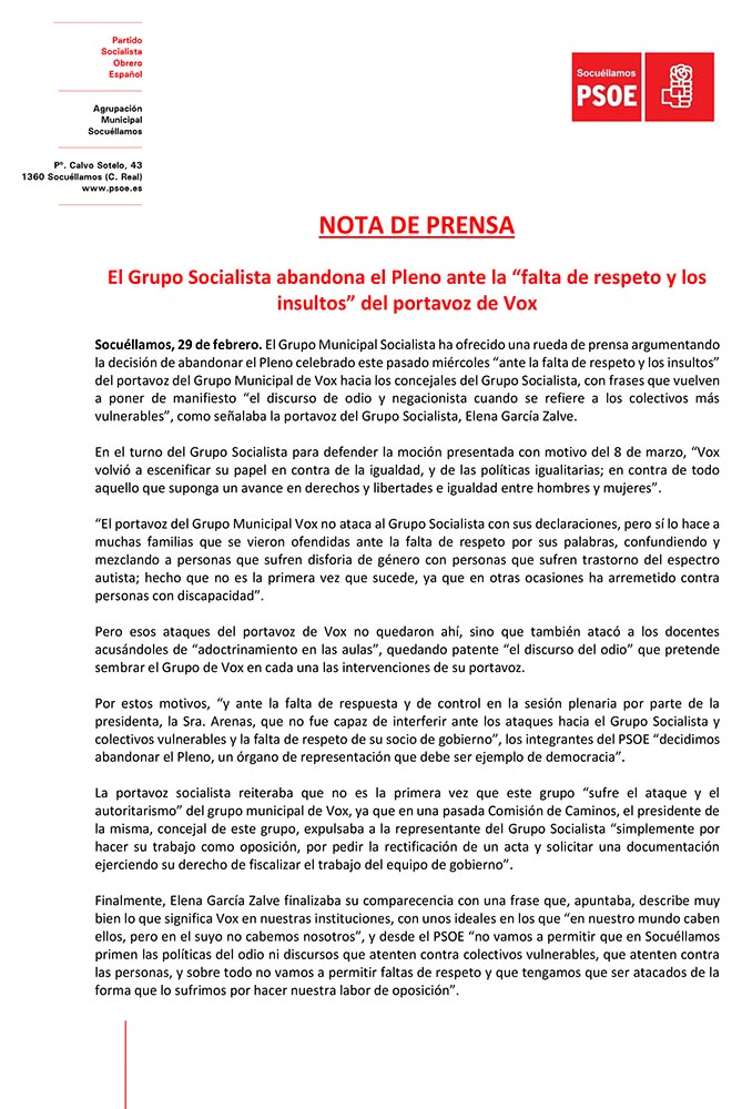 Socuéllamos, 29 de febrero. El Grupo Municipal Socialista ha ofrecido una rueda de prensa argumentando la decisión de abandonar el Pleno celebrado este pasado miércoles “ante la falta de respeto y los insultos” del portavoz del Grupo Municipal de Vox hacia los concejales del Grupo Socialista, con frases que vuelven a poner de manifiesto “el discurso de odio y negacionista cuando se refiere a los colectivos más vulnerables”, como señalaba la portavoz del Grupo Socialista, Elena García Zalve.