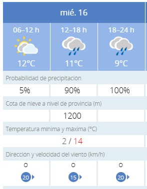 Según los pronósticos de la AEMET va a ser muy difícil que salgan las procesiones del Miércoles Santo en Socuéllamos, dando un 90% de probabilidad de precipitación entre las 12:00 y las 18:00 h. y un 100% de las 18:00 a las 24:00 h. además de bajas temperaturas con una heladora mínima de 2º y la cota de nieve en 1200 metros en la provincia de Ciudad Real.