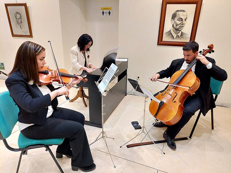 El acto estuvo envuelto por un exquisito repertorio clásico interpretado por Alberto Condés Perona (violonchelo) y Celia Barceló Perona (violín), nietos del homenajeado, y su hija Paqui Perona González (piano).