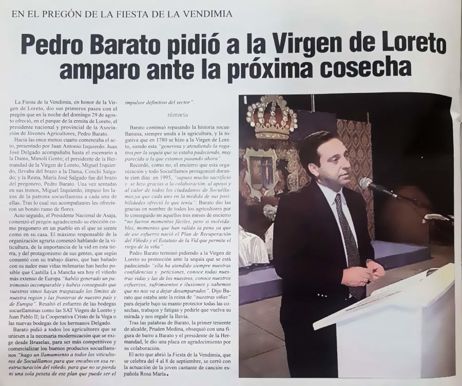 Coincidiendo con la reelección de Pedro Barato como vicepresidente de los agricultores europeos aprovechamos para recordar que hace 25 años este señor era el Pregonero de las Fiestas de la Vendimia en honor a la Virgen de Loreto (todavía no se llamaba Manchavino) como presidente de Asaja, cargo en el que continúa. Un hecho que nos invita a una reflexión sobre el relevo generacional en los cuadros que dirigen nuestras instituciones.