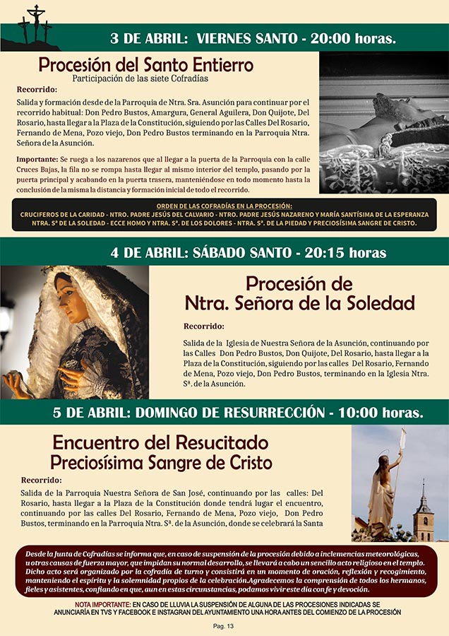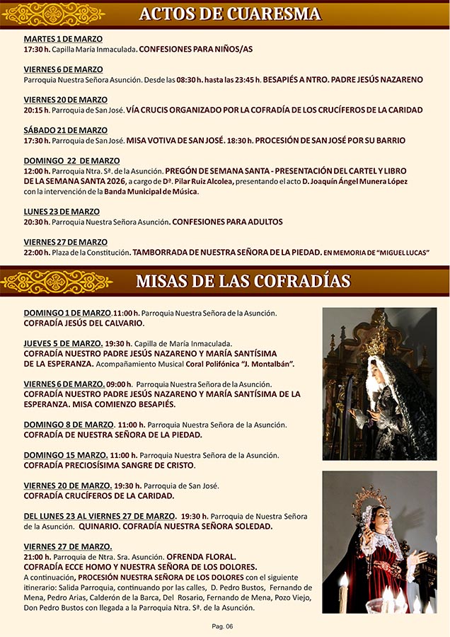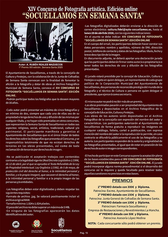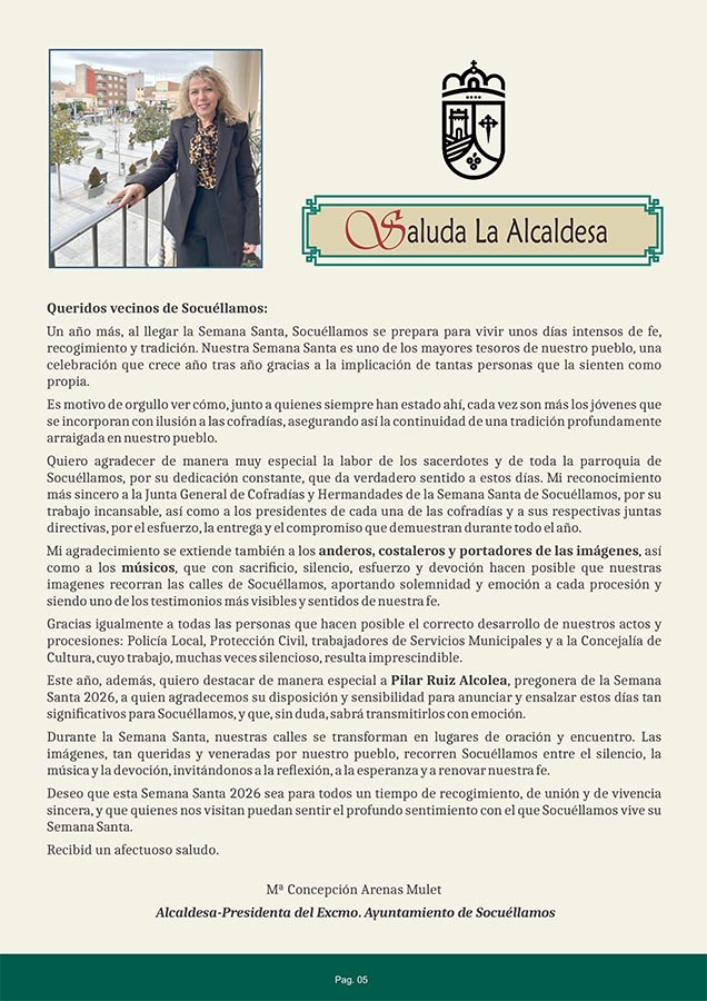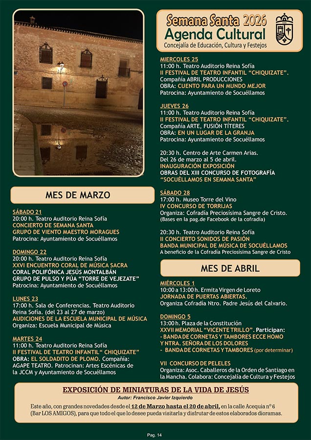 CULTURA Programa Oficial de Semana Santa 2026 marzo 23, 2026 FacebookTwitterWhatsAppEmailTelegram - Publicidad - Aquí puede consultar el Programa Oficial de Semana Santa 2026: - Publicidad - TagsPROGRAMA DE SEMANA SANTASEMANA SANTA 2026 MÁS NOTICIAS Santoral del 24 de marzo. Catalina, Maccartemio, Secúndulo y Severo. Santoral del 22 de marzo. Bienvenido, Basilio, Epafrodito, Lea, Nicolás y Pablo. El Yugo UD Socuéllamos no se rinde y gana al Quintanar del Rey La Cofradía de los Crucíferos de la Caridad celebró su Misa de Hermandad homenajeando a varios de sus miembros. Esta Semana Santa los pasos de la procesión del Santo Entierro saldrán desde la Casa de la Encomienda CULTURA Programa Oficial de Semana Santa 2026 marzo 23, 2026 FacebookTwitterWhatsAppEmailTelegram - Publicidad - Aquí puede consultar el Programa Oficial de Semana Santa 2026: - Publicidad - TagsPROGRAMA DE SEMANA SANTASEMANA SANTA 2026 MÁS NOTICIAS Largo e intenso pleno de marzo La fuerza de la palabra Resultados del Cristo de la Vega Cabezuelo Foods Senior y Femenino Victoria del EB Cabezuelo Socuéllamos sobre el CB Daimiel que empieza bien de cara al ascenso Esta Semana Santa los pasos de la procesión del Santo Entierro saldrán desde la Casa de la Encomienda