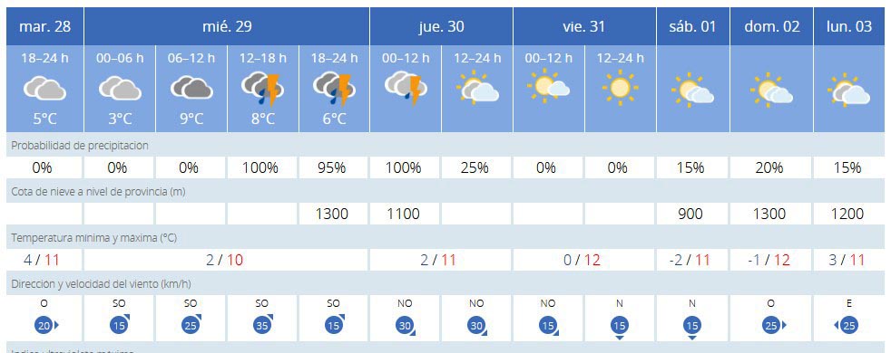 El jueves es probable que el viento gire a norte e irrumpa en la Península una masa de aire muy fría de origen polar. De cumplirse este escenario las nevadas pasarían a ser el fenómeno más significativo. Las precipitaciones más importantes quedarían restringidas al tercio norte peninsular, y la cota de nieve podría desplomarse hasta los 500 – 700 metros, con nevadas copiosas en la cordillera Cantábrica y Pirineos. También podrían ser significativas, aunque esperándose espesores menos importantes, en el resto de las zonas de montaña y en puntos de la meseta Norte, donde la probabilidad es menor cuanto más al oeste. Las rachas de viento muy fuertes serán probables en la mitad norte peninsular, especialmente en zonas de montaña, en el valle del Ebro y Ampurdán, con temporal marítimo que se extenderá al Mediterráneo debido al cierzo y a la tramontana.