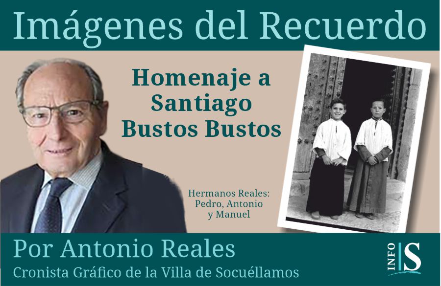 La noticia del fallecimiento de Santiago Bustos Bustos, acaecida hace unos días, en Cuenca, ciudad en la que residía desde hace tiempo, me ha hecho recordar momentos de tiempos pasados, cuando yo era casi un niño, y acompañaba a mis hermanos Pedro o Manolo a la iglesia, ayudándoles a llevar alguna cámara o flash, con los que ellos realizaban los reportajes de las bodas, bautizos y comuniones; y allí, en la iglesia, estaba siempre Santiago, al que cariñosamente le llamábamos “Santiaguete”, más niño aún que yo, vestido de monaguillo, desempeñando las tareas propias de esta actividad, que entre otras eran: