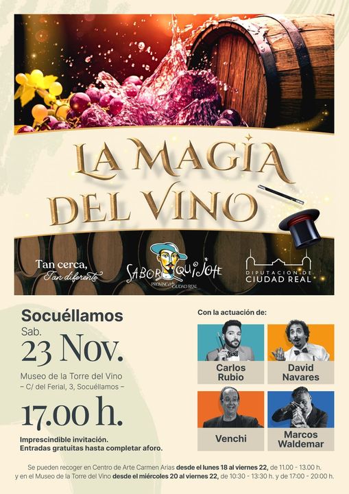 En la Torre del Vino habrá una demostración gastronómica con una cuidada selección de vinos de Socuéllamos maridados con productos de la provincia. Y por la tarde el evento culminará con un espectáculo abierto al público, protagonizado por los magos Carlos Rubio, David Navares, Marcos Waldemar y Venchi, acompañados por una degustación de vinos. “El aforo es limitado, por lo que las entradas estarán disponibles en la Torre del Vino y en la Casa de Arte Carmen Arias, puntos habilitados por el Ayuntamiento”, ha recordado.