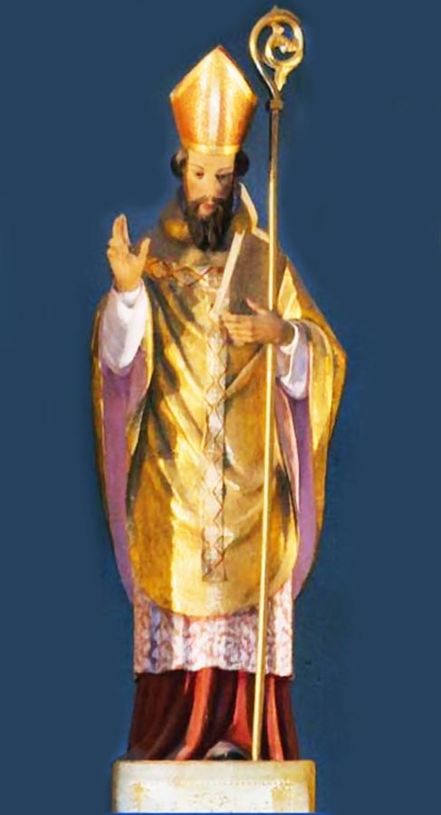 En esta ocasión nos encontramos con dos santos con el mismo nombre, ambos nacidos entre los siglos V y VI, a la par que también fueron obispos. Se trata, uno de san Fulgencio de Ruspe (1), quien nació en Cartago, África, hacia el año 468. El otro, san Fulgencio de Cartagena o Fulgencio de Astigi (Cartagena, siglo VI - 630) fue un noble y sacerdote cristiano hispano del siglo VI. Nos vamos a centrar en el segundo, pues, por su representación iconográfica parece ser el que ocupa la hornacina a la izquierda del altorrelieve de Ntra. Sra. de la Asunción. Fulgencio nació en Cartagena en torno al año 540 y pronto su familia se traslada a Sevilla. En dicha ciudad serían arzobispos sus hermanos Leandro e Isidoro. San Fulgencio fue obispo de Écija o Astigi en dos ocasiones y como tal asistió al II Concilio Hispalense (610). Igualmente lo fue también de la diócesis de Cartagena, su ciudad natal. Hombre elocuente y gran orador, Recaredo (2) le encomendó diversas misiones para su reino. Hijo de Severiano o Severino al cual se le adjudica el título de dux (si bien su hermano Isidoro menciona que era simplemente un ciudadano), y Teodora o Túrtura. Su padre fue un noble hispanorromano. Fulgencio fue el segundo de cinco hermanos, cuatro de los cuales son considerados santos por la Iglesia católica y la Iglesia ortodoxa. Sus otros hermanos canonizados son Isidoro de Sevilla, Leandro de Sevilla y Florentina de Cartagena. Todos ellos son conocidos como los Cuatro Santos de Cartagena (la quinta alegada hermana fue Teodora o Teodosia, madre de Hermenegildo (3), quien también subió a los altares). Fulgencio es patrón de la diócesis de Cartagena y, desde el siglo XVI, también da nombre al Seminario Mayor de Murcia. Es, además, patrón de la ciudad de Plasencia y su diócesis. Fue considerado un hombre sabio, siendo elevado al rango de doctor de la Iglesia en 1880 por León XIII. La mayor parte de sus reliquias están en la iglesia de San Juan Bautista de Berzocana (Cáceres), junto con las de su hermana santa Florentina. También hay reliquias de san Fulgencio y santa Florentina en la catedral de Murcia, enviadas desde Berzocana por orden de Felipe II. Por decisión de este rey también hay alguna reliquia menor en San Lorenzo de El Escorial. Las representaciones de los Cuatro Santos tanto en pintura como en escultura han sido un tema común en la Región de Murcia a lo largo de los siglos. Aunque muchas fueron destruidas durante la Guerra Civil en 1936, se salvó alguna de las más significativas, como las esculturas realizadas por Francisco Salzillo en 1755. Imágenes de los cuatro santos los podemos ver en el imafronte (4) de la Catedral de Murcia, en el Altar Mayor de la misma y en otros lugares del templo. En la imagen, objeto de nuestro relato, aparece de pie, con la cabeza ligeramente agachada, bendiciendo con la mano derecha, en alto, y con la izquierda sujeta libro y báculo. Está ataviado con el traje de obispo, con mitra y báculo como jefe de la Iglesia. Es venerado como santo por la Iglesia Católica que celebra su fiesta litúrgica el 16 de enero.