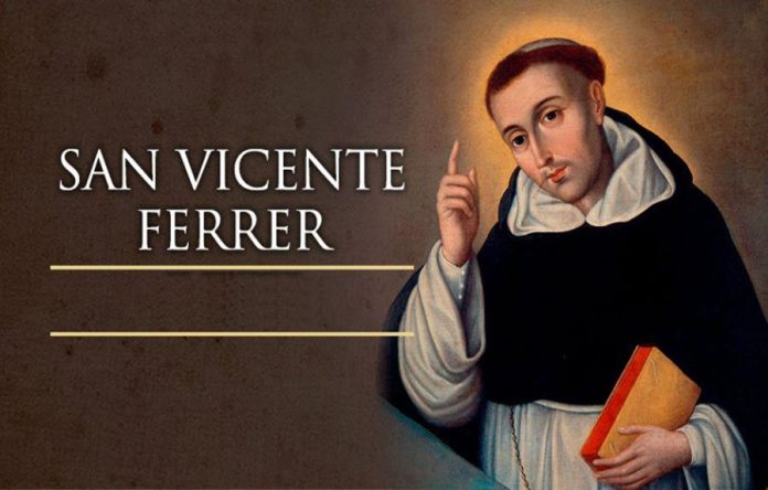 San Vicente Ferrer, presbítero de la Orden de Predicadores, que, de origen español, recorrió incansablemente ciudades y caminos de Occidente, solícito por la paz y la unidad de la Iglesia, predicando a pueblos innumerables el Evangelio de la penitencia y la venida del Señor, hasta que en Vannes, de la Bretaña Menor, en Francia, entregó su espíritu a Dios. Una anécdota curiosa de san Vicente, es que regalaba a las señoras que peleaban mucho con su marido, un frasquito con agua bendita y les recomendaba: "Cuando su esposo empiece a insultarle, échese un poco de esta agua a la boca y no se la pase mientras el otro no deje de ofenderla". Y esta famosa "agua de Fray Vicente" producía efectos maravillosos porque como la mujer no le podía contestar al marido, no había peleas. Ojalá que en muchos de nuestros hogares se volviera a esta bella costumbre de callar mientras el otro ofende. Porque lo que produce la pelea no es la palabra ofensiva que se oye, si no la palabra ofensiva que se responde. (s. XIV)