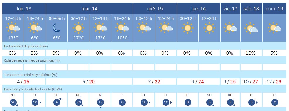 - Martes 14: Los cielos se despejarán por completo y el sol ganará terreno. Se notará el inicio de la escalada térmica con máximas de veinte grados en las horas centrales, aunque las madrugadas seguirán siendo frías, con mínimas de cinco grados. El viento irá perdiendo fuerza hasta llegar a la calma al final de la jornada.