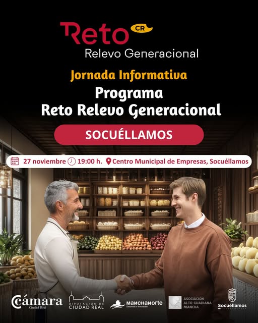 Este jueves 27 de noviembre, a las 19:00 horas, el Centro de Empresas de Socuéllamos será el escenario de una jornada informativa dedicada al programa “Reto Relevo Generacional”, una iniciativa dirigida a garantizar la continuidad del tejido empresarial local que cuenta con la colaboración de la concejalía de Desarrollo Económico.