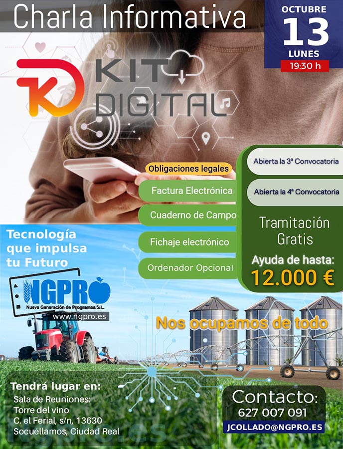 La empresa NGPRO (Nueva Generación de Programas S.L.) organiza una charla informativa el próximo lunes 13 de octubre a las 19:30 horas en el salón de conferencias de la Torre del Vino de Socuéllamos (Ciudad Real).