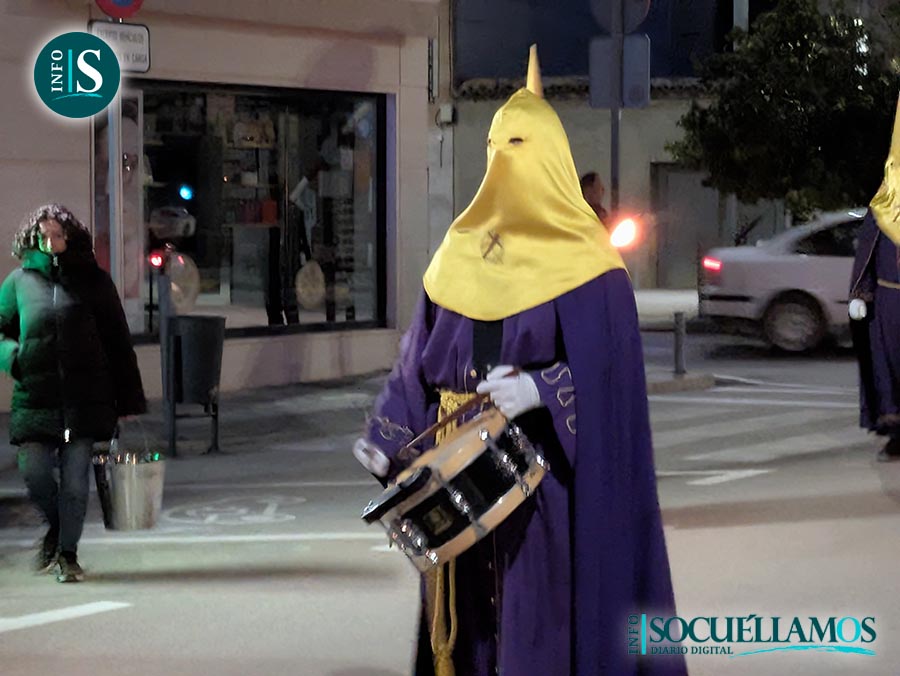 La procesión, caracterizada por su sobriedad, ha vuelto a ofrecer una estampa íntima, en la que el silencio solo se ha visto interrumpido por el sonido de los tambores y la lectura de textos de los Evangelios de la Pasión, elementos que refuerzan el carácter meditativo del acto.