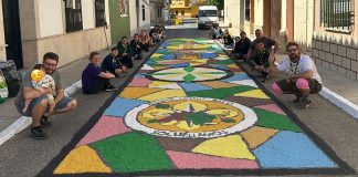 La Cofradía de Ntro. Padre Jesús del Calvario, el Grupo Scout Baco y los niños de la parroquia elaboran las alfombras del Corpus.