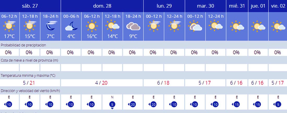 Según la predicción de la AEMET Agencia Estatal de Meteorología se esperan temperaturas moderadas sin heladas matinales y con ausencia de lluvias para Socuéllamos. La máxima de hoy sábado llegará a los 21º siguiendo los próximos días la misma tónica con ligeras bajadas de la temperaturas máximas, las mínimas oscilarán entre los 4º y los 6ºC.