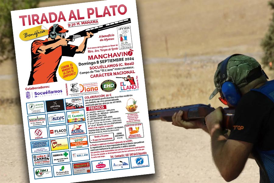 Organizada por la dirección del Campo de Tiro El Llano (Agustín Alarcón y Encarni Toledo) y la Sociedad de Cazadores DIANA, y con la colaboración del Ayuntamiento de Socuéllamos, el próximo domingo 8 de septiembre se celebrará una Tirada al Plato Benéfica a favor de AFYMOS en el marco de las fiestas en Honor a Ntra. Sra. de Loreto 'MANCHAVINO'.