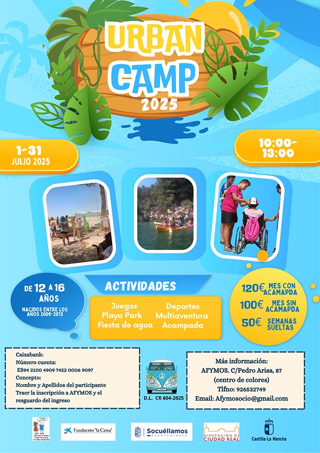 Este campamento es una opción alternativa a los campus deportivos, ya que ofrece multitud de actividades tales como gymkhanas, piscina, manualidades, fiesta holi (polvos de colores), multiaventura. Además, se realizarán dos excursiones; una a Playa Park (Parque acuático de Ciudad Real) y otra una acampada en el Parque Natural de la Lagunas de Ruidera.