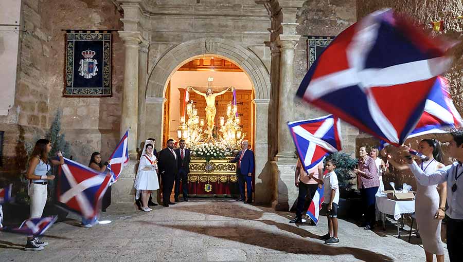 Los abanderados han honrado al Cristo de la Vega en la puerta de la Parroquia de Nuestra Señora de la Asunción antes de salir la procesión.