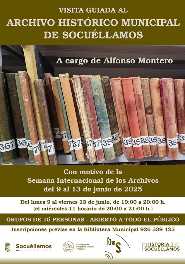 Con motivo del Día Internacional de los Archivos que se celebra el 9 de junio, y la Semana Internacional de los Archivos, (del 9 al 13 de junio) desde la Concejalía de Cultura del Ayuntamiento de Socuéllamos y, en concreto, la Biblioteca Municipal con la colaboración de la Asociación Historia de Socuéllamos organizarán una visita guiada al archivo histórico municipal que estará a cargo del vicepresidente de esta asociación, Alfonso Montero, un referente en la comunidad de amantes de la cultura local.