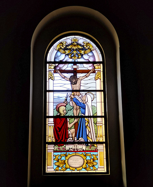 Estas tres ventanas albergarán nuevas vidrieras. La que ocupa el tercer hueco desde la puerta principal ya cuenta con una (María al pie de la Cruz) y las otras dos tienen un vinilo en el cristal de protección con escenas de la Virgen María.