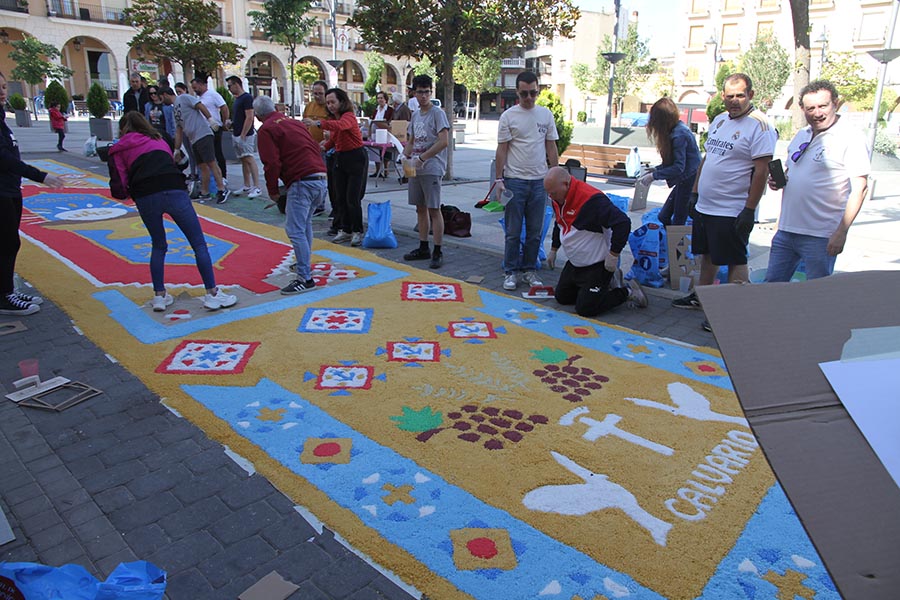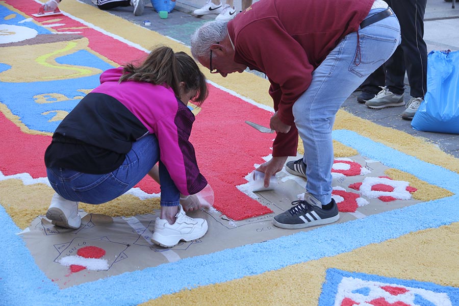Este año, como otros anteriores, está colaborando especialmente en la realización de estas alfombras la Cofradía de Ntro. Padre Jesús del Calvario. Se tiene que hacer el mismo día de la Procesión porque no se puede paralizar el tránsito por mucho tiempo, así que el domingo por la mañana temprano todos los voluntarios trabajan afanosamente para que las coloridas alfombras luzcan en todo su esplendor. Cuando terminan, desayunan churros con chocolate todos juntos. Aquí podemos ver algunas imágenes de los voluntarios en plena faena.