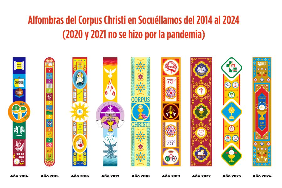 Como se puede observar se suele incluir en la alfombra motivos o logos de algún acontecimiento importante a nivel social o a nivel de Iglesia como por ejemplo las JMJ o el centenario de la Unión Deportiva Socuéllamos. También se hace una alfombra realizada por los niños, que está colocada a continuación de la alfombra más grande.