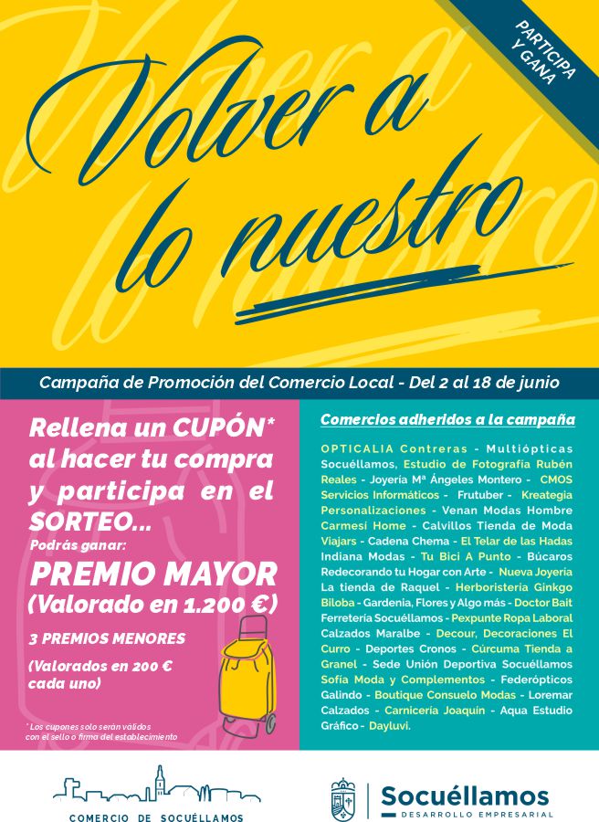Los comercios que participan son: Opticalia Contreras, Multiópticas Socuéllamos, Estudio de Fotografía Rubén Reales, Joyería Mª Ángeles Montero, CMOS Servicios Informáticos, Frutuber, Kreategia Personalizaciones, Venan Modas Hombre, Carmesí Home, Calvillos Tienda de Moda, Viajars, Cadena Chema, El Telar de las Hadas, Indiana Modas, Tu Bici A Punto, Búcaros Redecorando tu Hogar con Arte, Nueva Joyería, La Tienda de Raquel, Herboristería Ginkgo Biloba, Gardenia - Flores y Algo más, Doctor Bait, Ferretería Socuéllamos, Pexpunte Ropa Laboral, Calzados Maralbe, Decour-Decoraciones El Curro, Deportes Cronos, Cúrcuma Tienda a Granel, Sede Unión Deportiva Socuéllamos, Sofía Moda y Complementos, Federópticos Galindo, Boutique Consuelo Modas, Loremar Calzados, Carnicería Joaquín, Aqua Estudio Gráfico y Dayluvi.