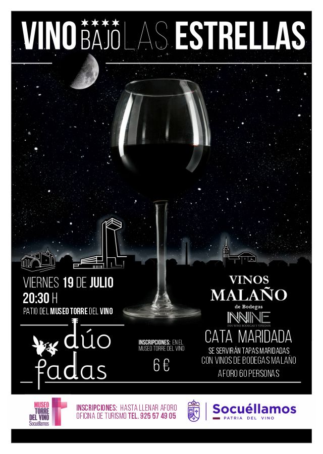 Vuelve la cita con el vino y la música en el MUSEO TORRE DEL VINO de Socuéllamos. Esta vez le toca a Bodegas INWINE, Vinos MALAÑO. Será el próximo viernes 19 de julio en el Patio del Museo Torre del Vino, a las 20:30 h. En una cata maridada entre Vinos Malaño y diversas tapas, todo ello amenizado con la música del DÚO FADAS.